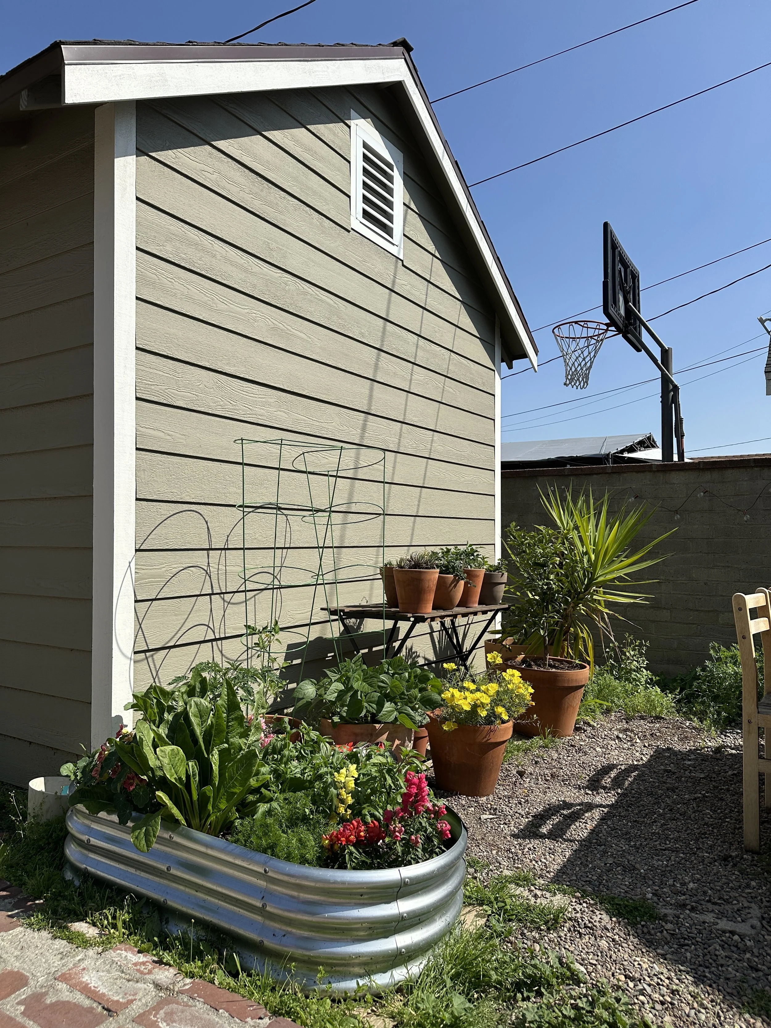 A stainless steel raised bed runs along one edge, filled with herbs and vegetables. Terracotta planters soften the corners, holding flowers and whatever else is in season. The rest is in the ground, planted densely to encourage pollinators and blur the lines between cultivated and spontaneous.